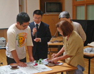 【写真:色素の性質を実験によって確かめる参加者(中央:中務明生物資源科学部准教授)】